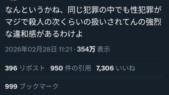 VIP 【画像】日本人男性「レ●プされた如きで殺人と同じ扱いされるの違和感ある」