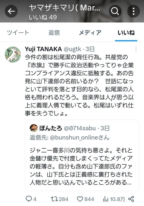 スマイルカンパニー所属のヤマザキマリ氏。山下達郎氏関連のリツイートが削除されているのを疑問に思い見てみると、約8ヶ月ぶりの怒濤のいいねがこの内容。松尾潔氏に対するSC社内の空気はこんな感じなんですね