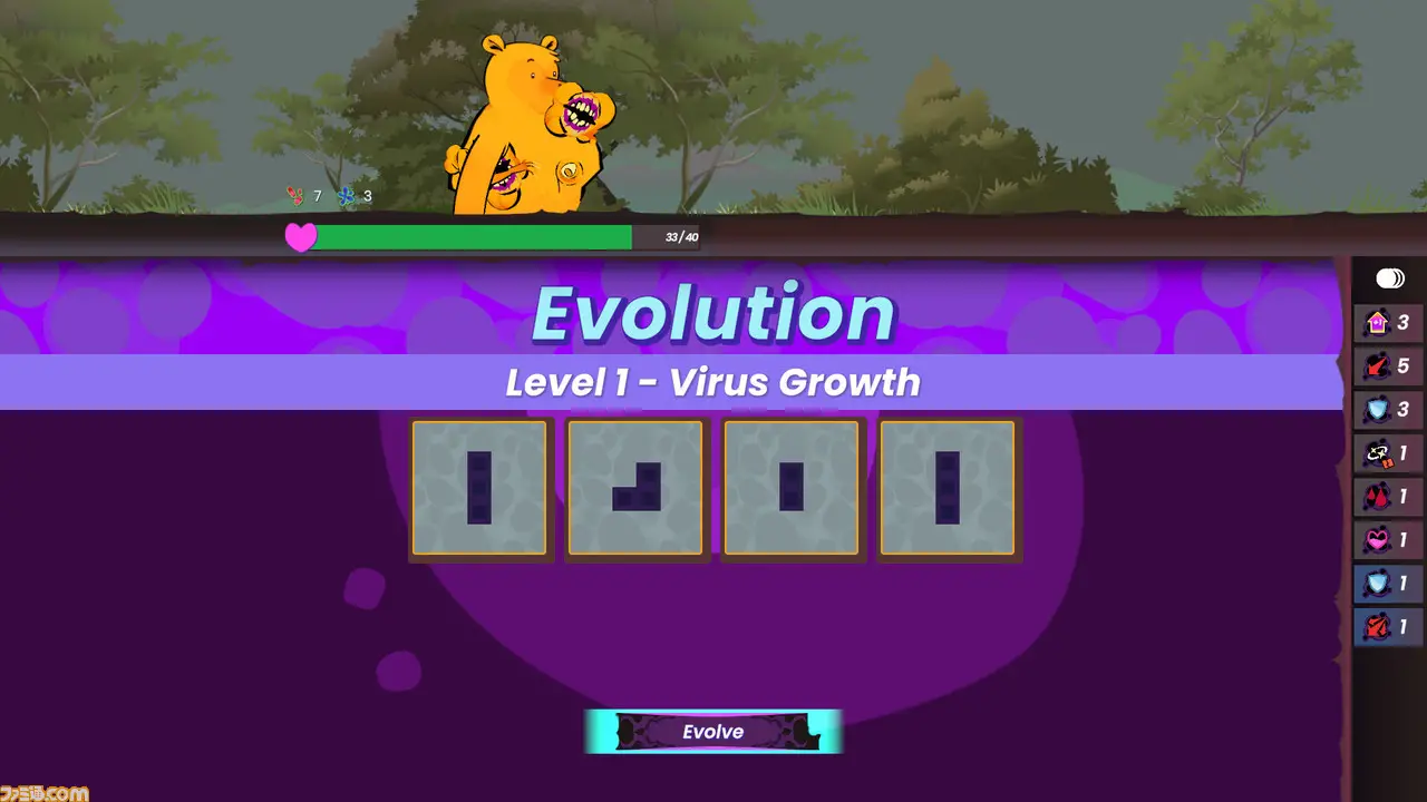 ゲームとしては、ランダム生成されるプーの体内の細胞組織を探索。その構造を突然変異させて作り換えていくことで、能力の相乗効果などを発揮できるようにし、プーが出会うさまざまな動物たちへの感染拡大を目指すというもの。こうしたゲームプレイで引き起こした数々の突然変異が、プーの外見にも反映されるようだ。