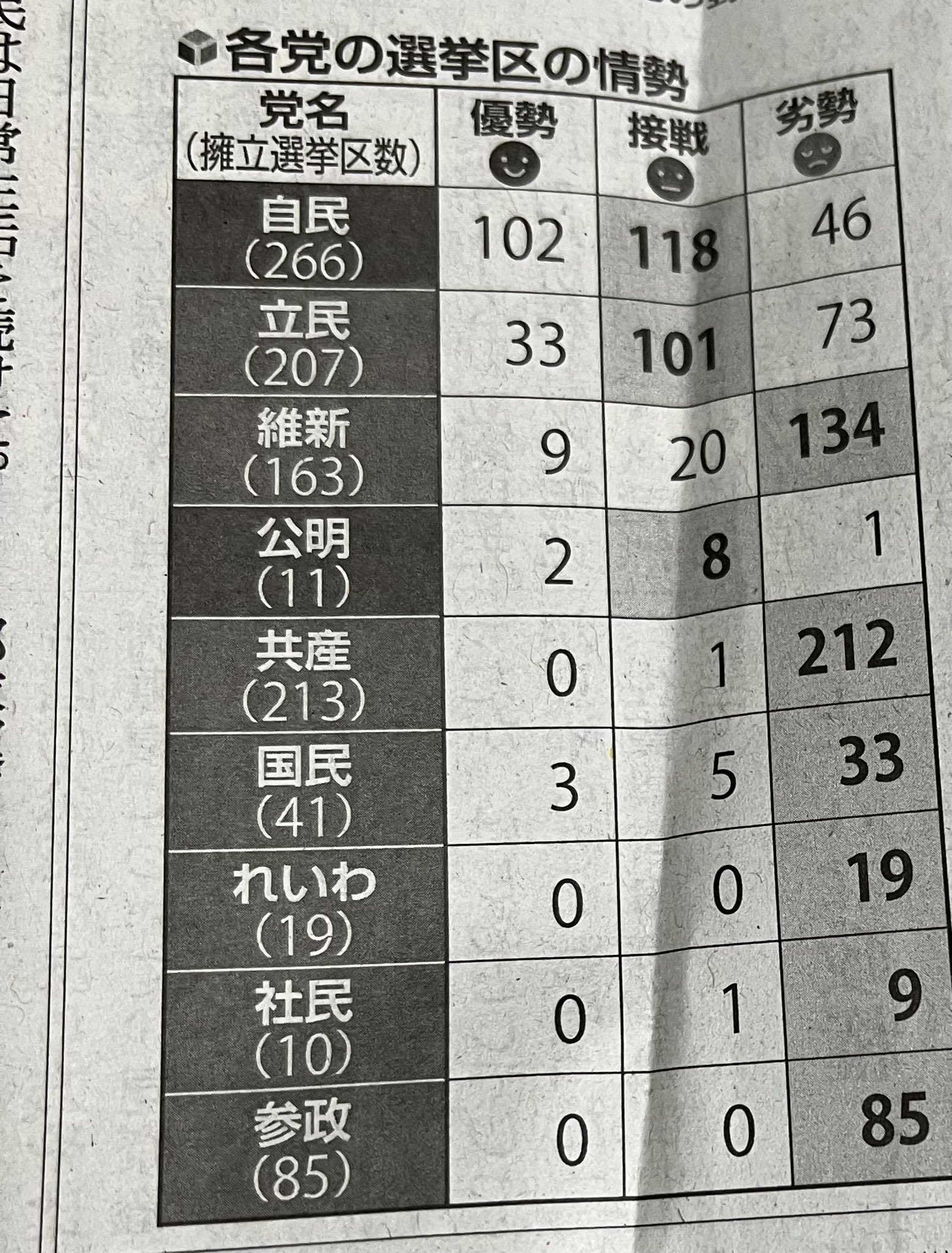 このペースでいけば自民党200立民66で結局自民党が大勝しそうだね