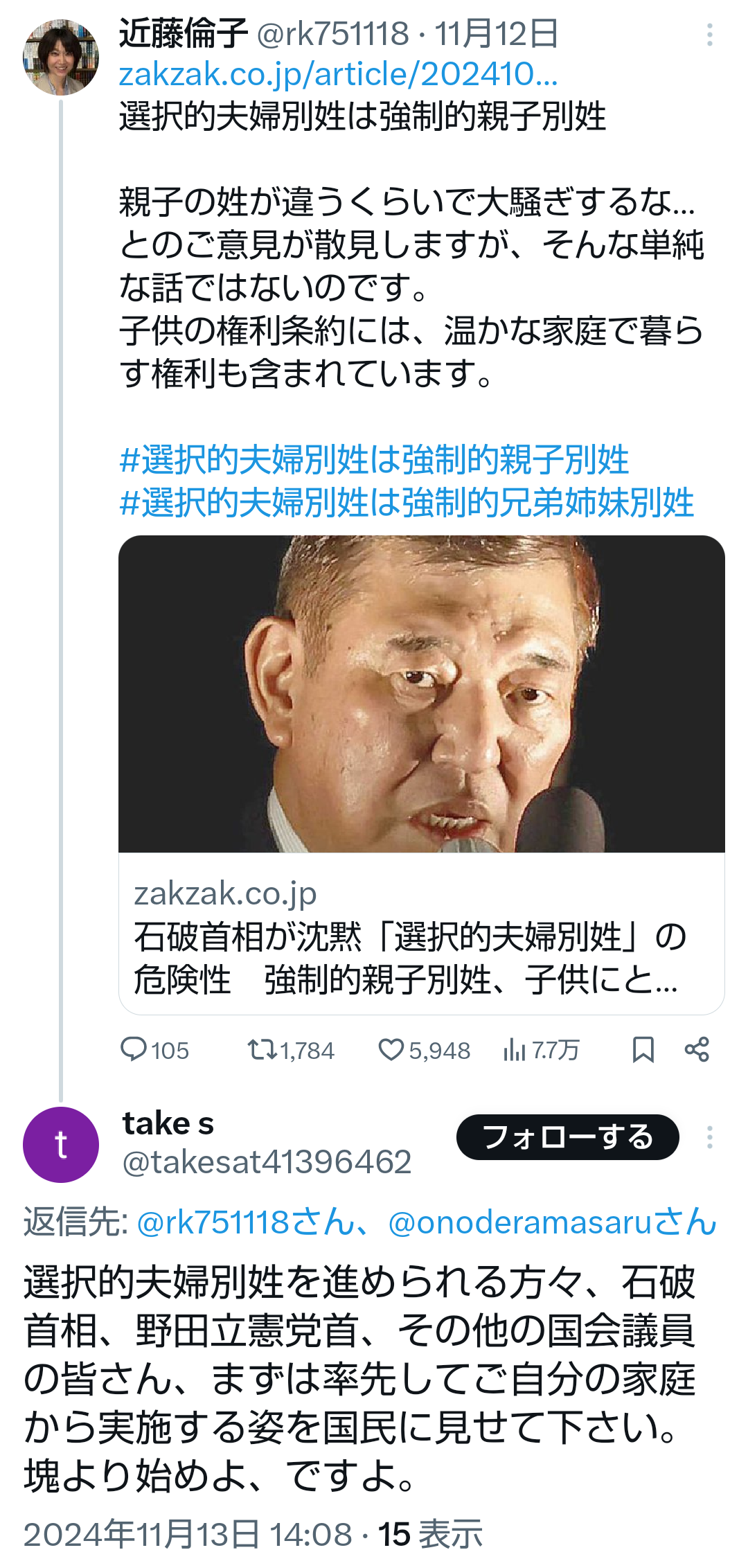 そんで「まず推進してる政治家から別姓にしてみろよ」って言ってんのかこいつ?