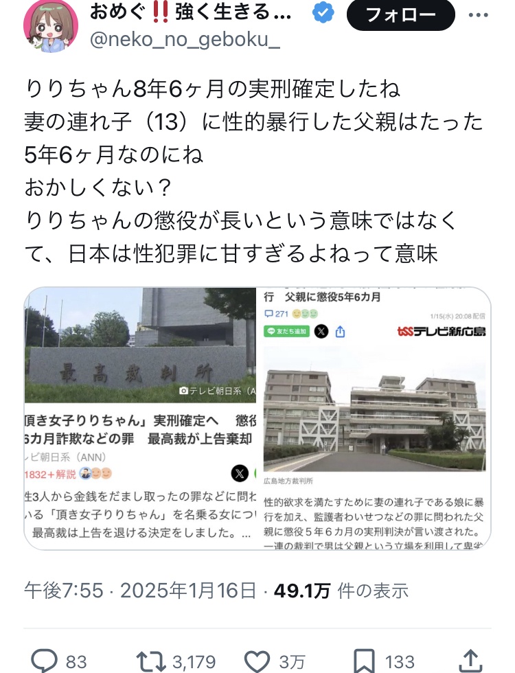 児童のレイプもそうだけど母親の子殺しとかも軽すぎて引く - 30 : 2025/01/18(土) 19:29:34.39 ID:X5qsebUi0
