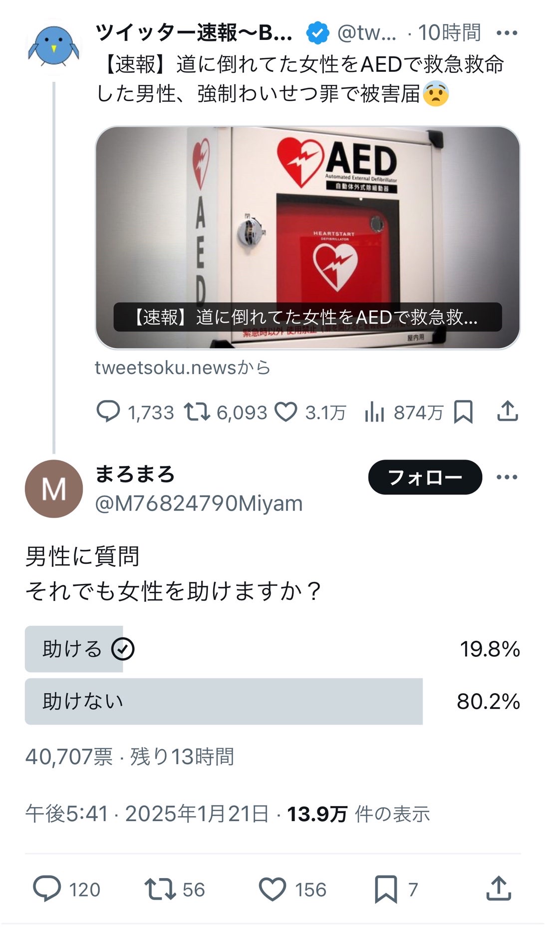 しかし女にAED使うと訴えられるそうだから女は助けたらダメだわ - 379 : 2025/01/22(水) 17:36:59.63 ID:JG1Hz1Ph0
