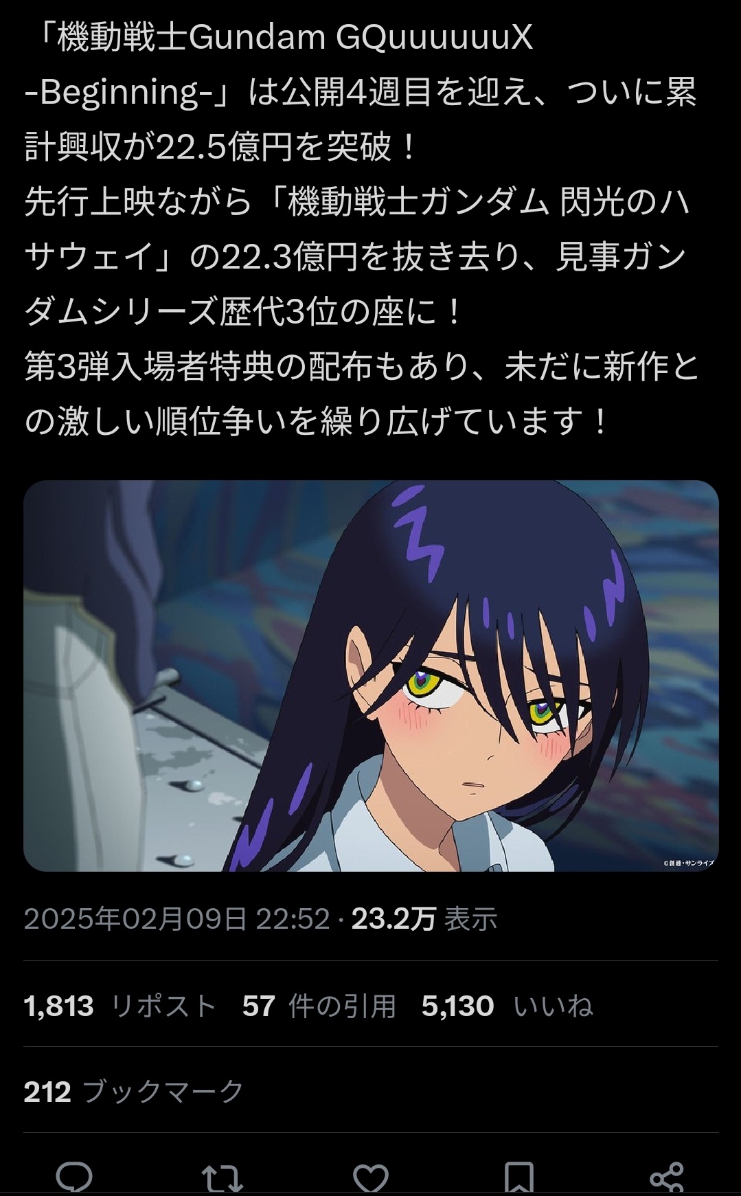 初代ガンダムが社会現象になったのは放映終了(しかも打ち切りで切り上げ)後に発売されたプラモデルの売上であって、アニメそのものではないからな。 - 131 : 2025/02/10(月) 11:59:03.09 ID:5jnp5SHxd