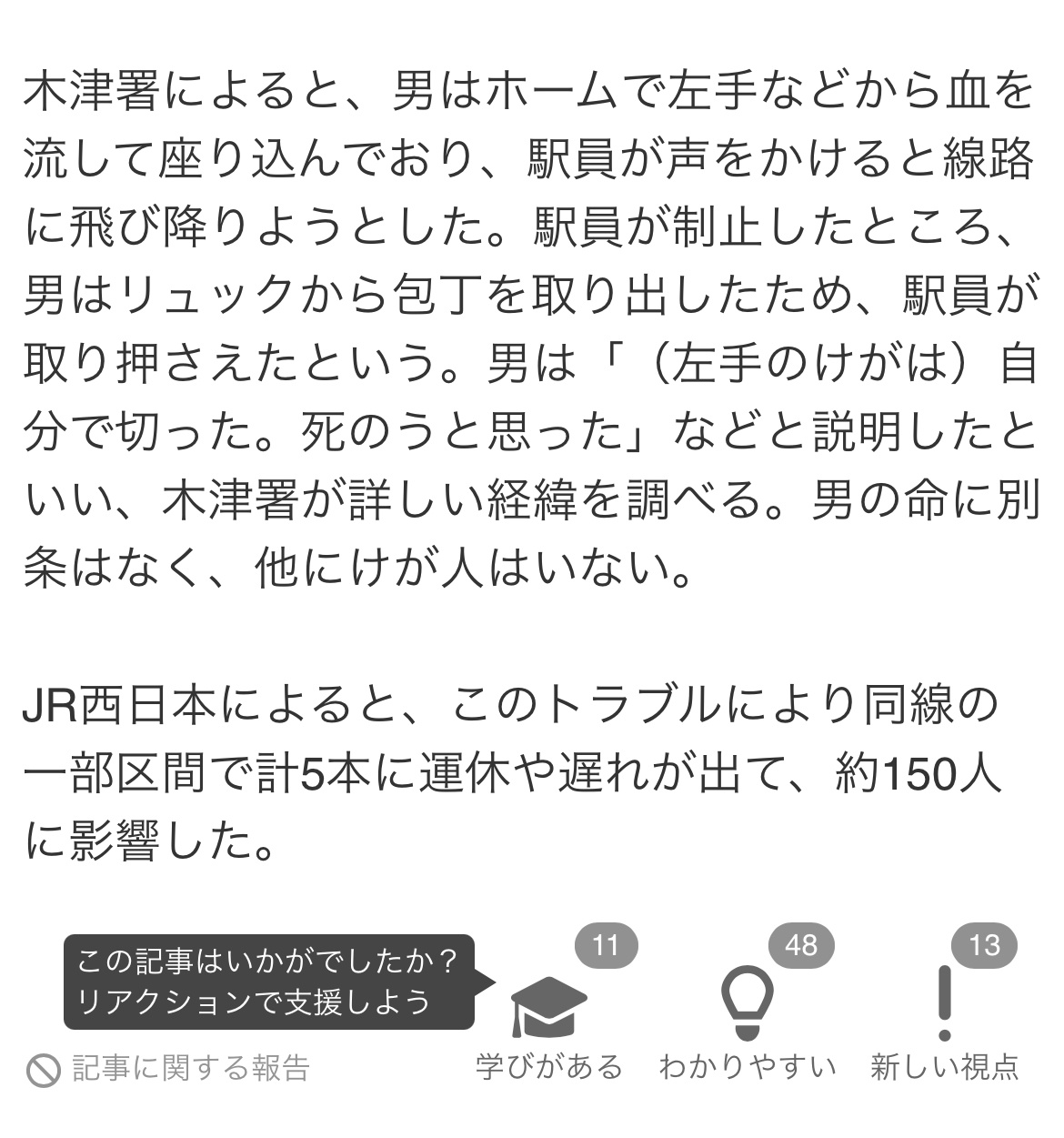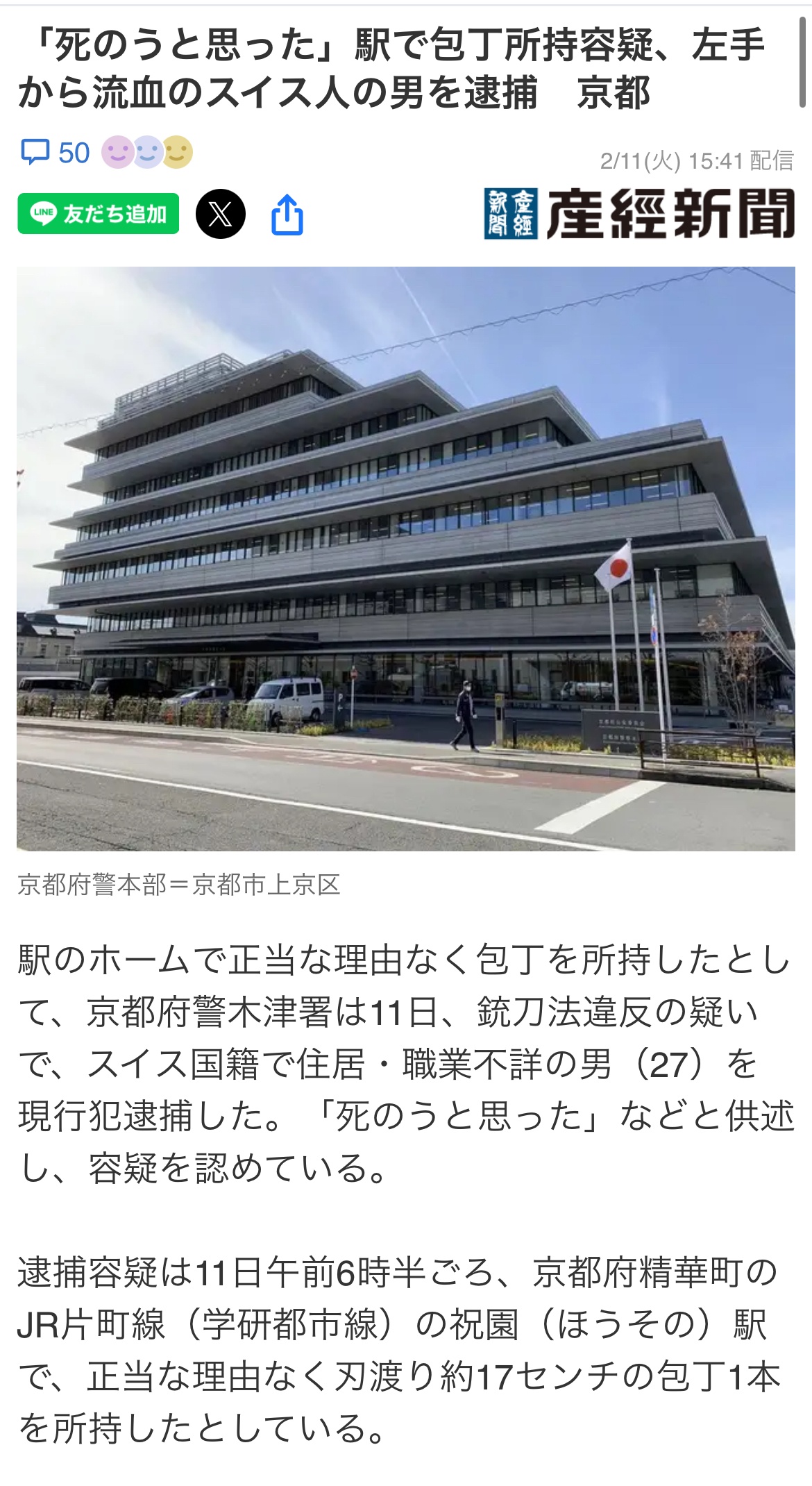 スイス人、駅でハラキリか。刃渡り17センチの包丁で左手を切る「死のうと思った」