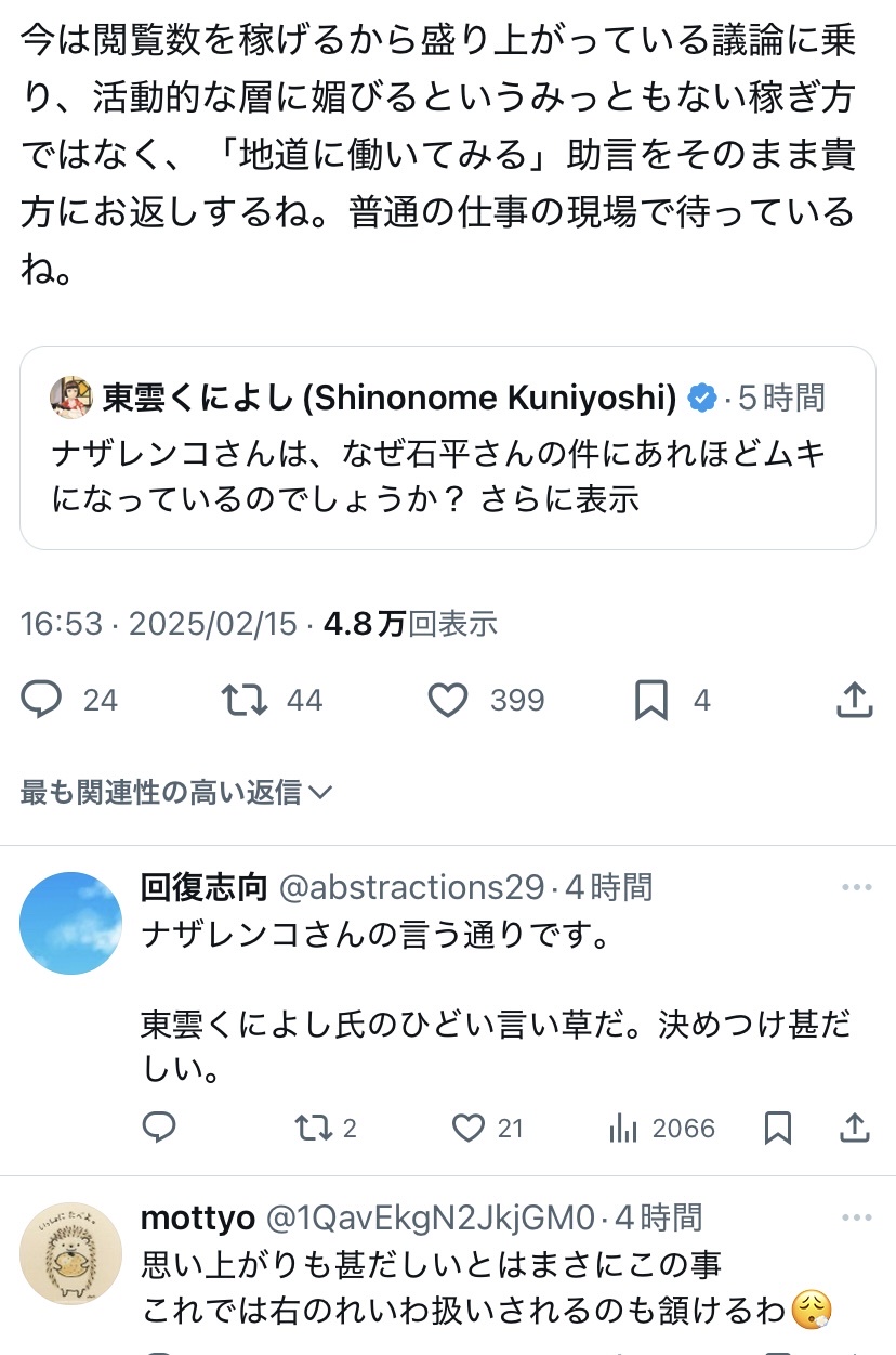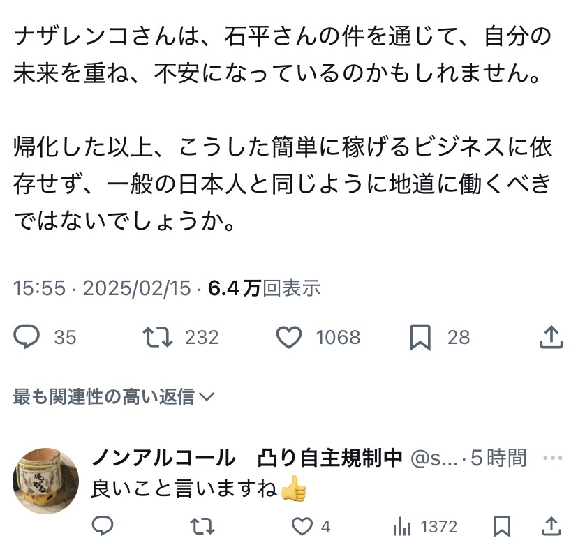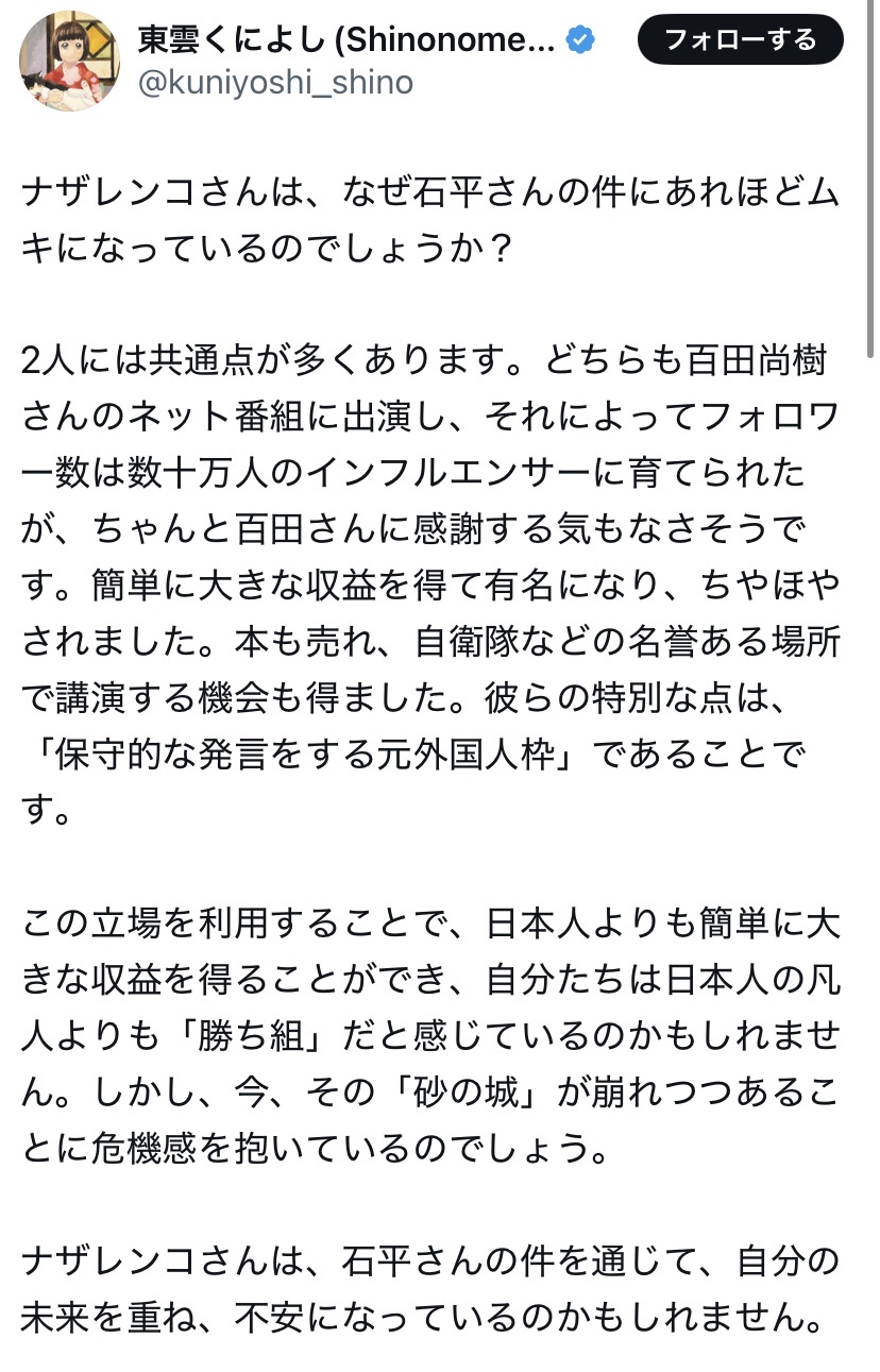 漫画家「ナザレンコさんは、石平さんの件を通じて、自分の未来を重ね、不安になっているのかもしれません。」→ナザさんガチギレ反論へ