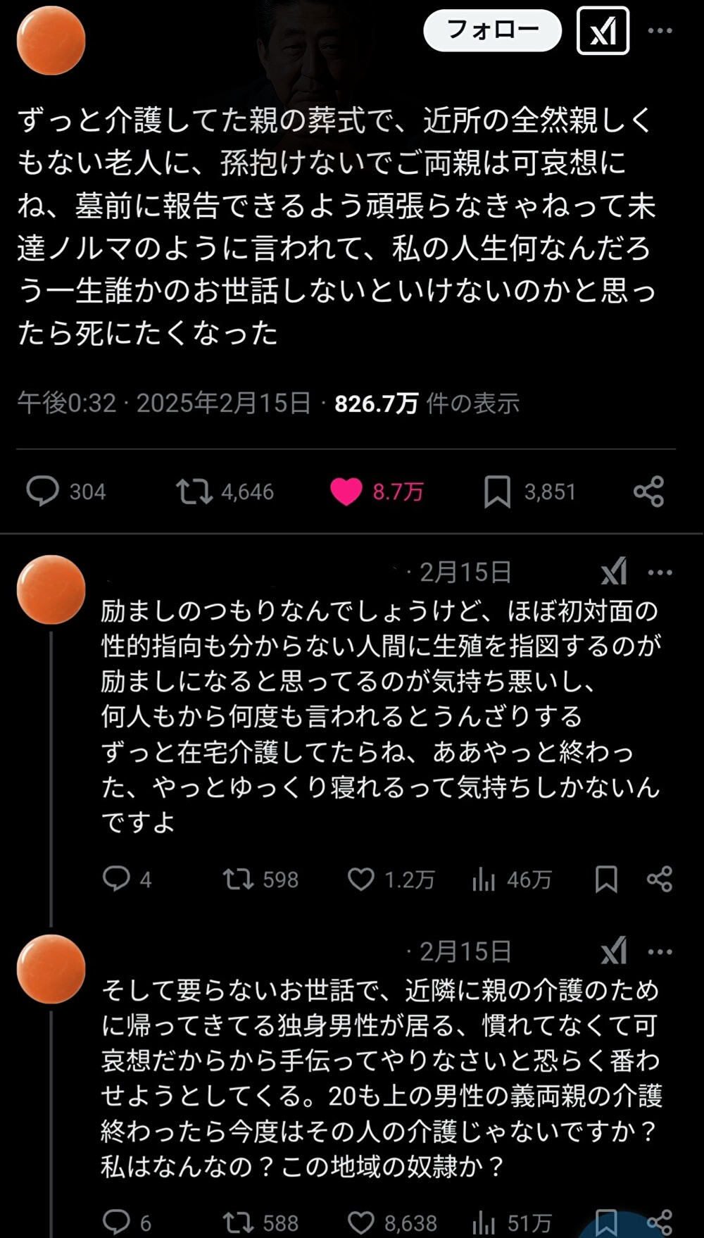ただ近所で独身のおっさんが親の介護してるから手伝いに行ってあげなさいはかなりウザいな - 34 : 2025/02/18(火) 12:31:34.31 ID:uW58cd66d