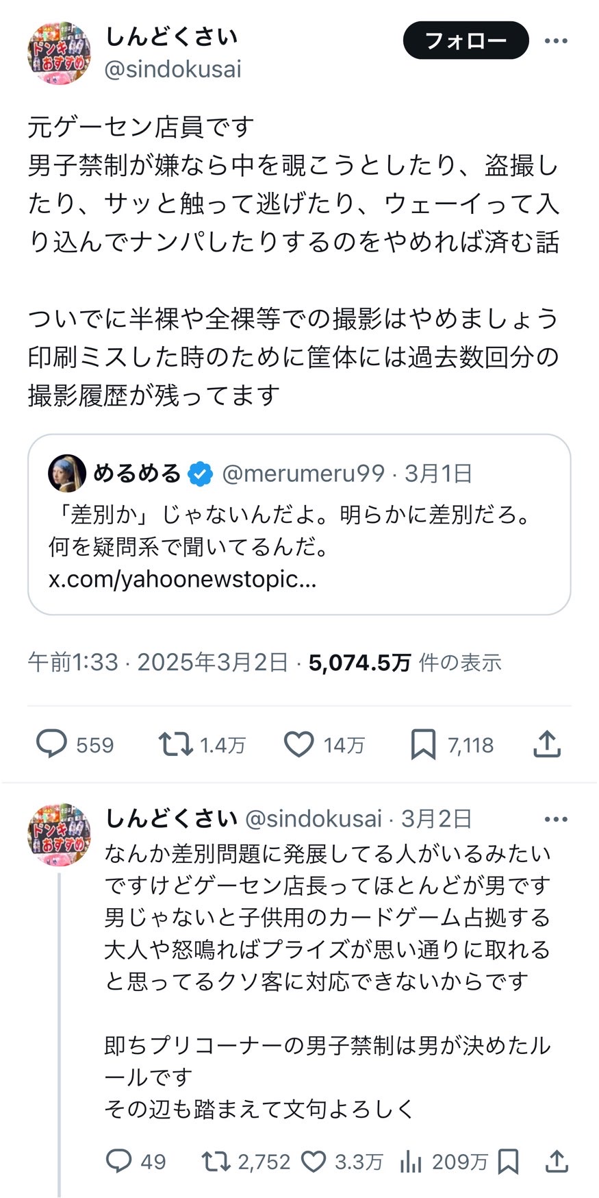 黒人差別と何ら変わらない論法を使っちゃう時点で所詮はゲーセン店員レベルよな - 98 : 2025/03/05(水) 09:53:03.87 ID:1sMo9TWN0