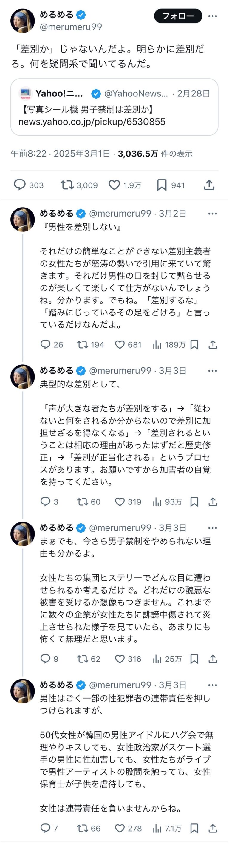 少数の問題行為によって属性を差別して良いのは男性に対してだけ