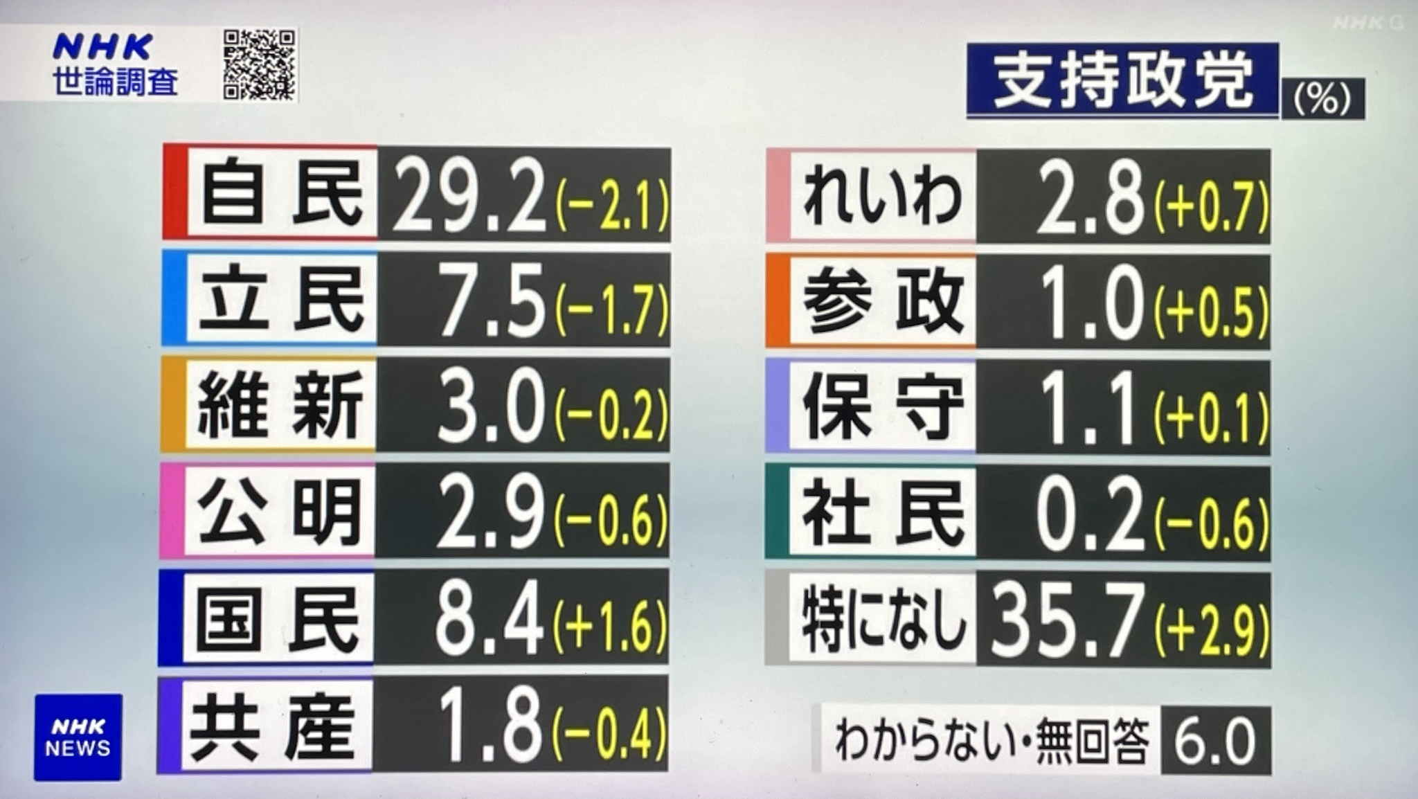 政党支持率、自民党29.2%国民8.4%立民7.5%維新3%公明2.9%れいわ2.8%共産1.8%参政1%保守1.1%社民0.2%なし35.7%