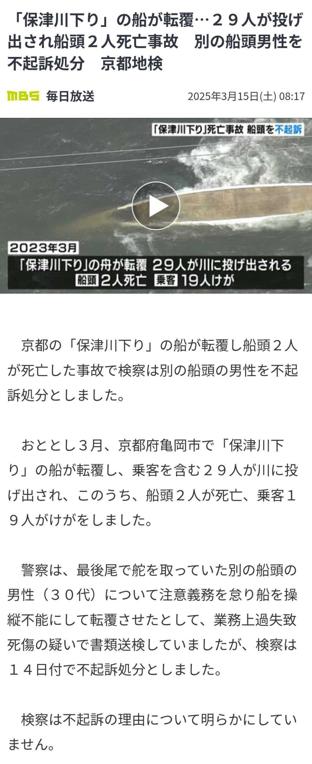 「保津川下り」の船が転覆…29人が投げ出され船頭2人死亡事故 別の船頭男性を不起訴処分