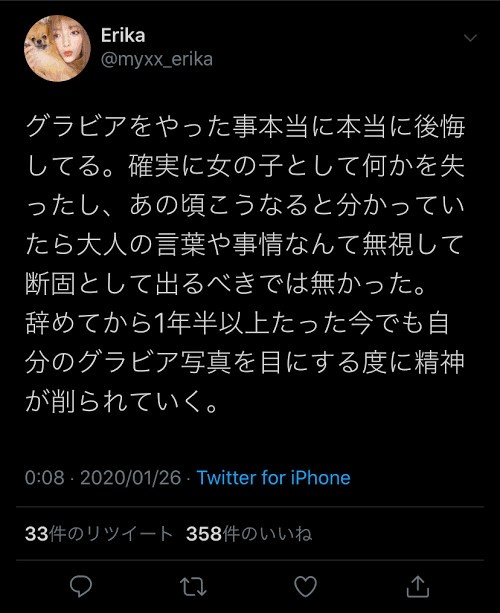 「かっこいいとか綺麗とか言われたくてグラビアやったのに実際にいただいたコメントはエ口いとかオカズにしたとかだったのでグラビアやった事を後悔した」