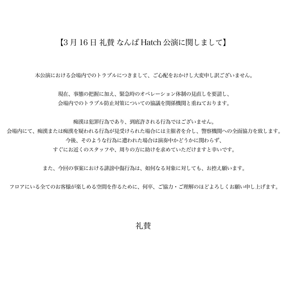 有名バンド「礼賛」ライブで痴漢発生も運営が犯人のライブを見る権利を主張し炎上🔥バンドコメントも炎上🔥