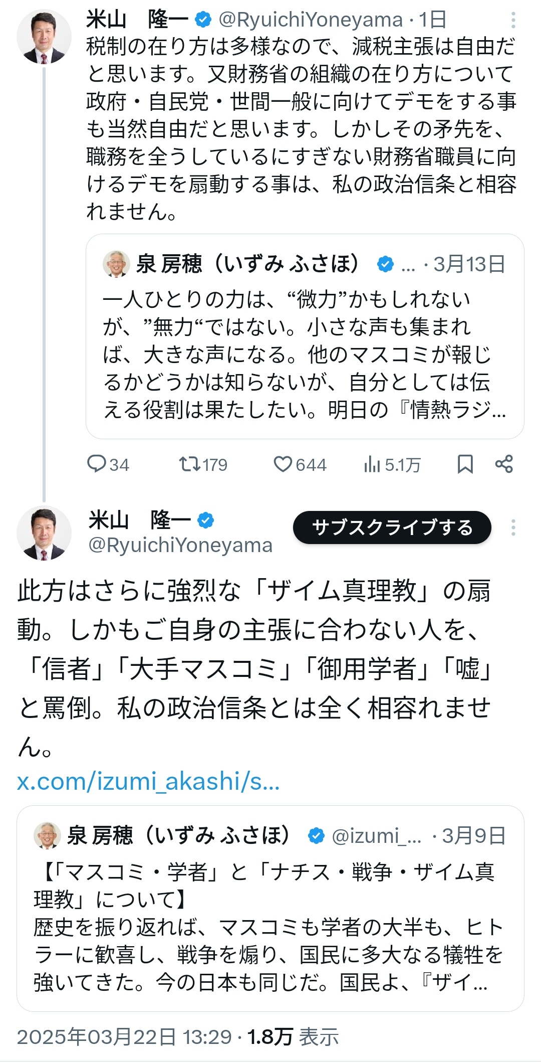 立憲・米山隆一さん、参院選立候補の泉房穂氏を「ザイム真理教の扇動をしている人。私の政治信条とは相容れません」と痛烈批判