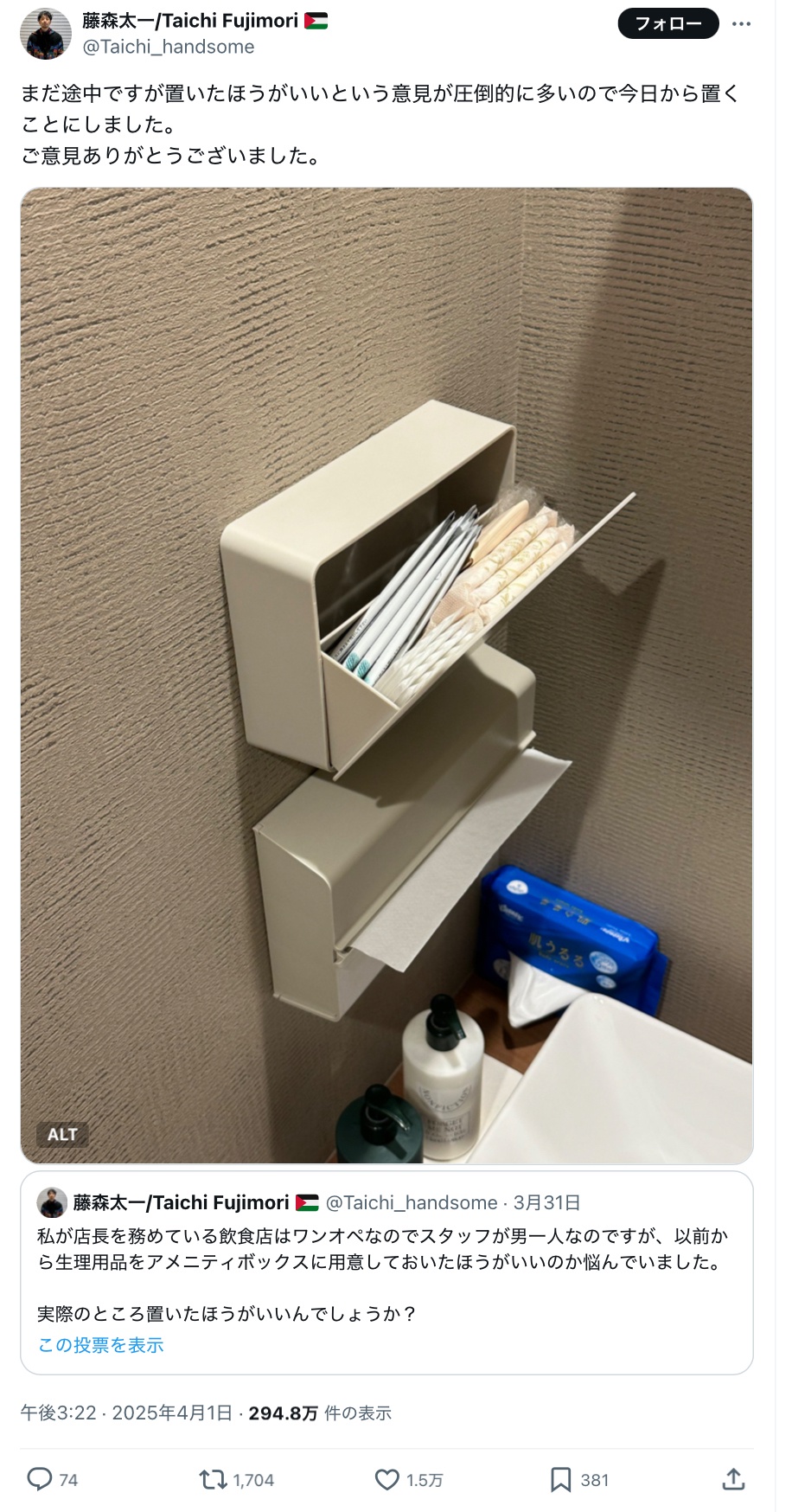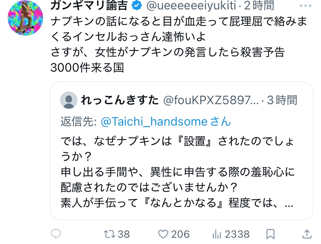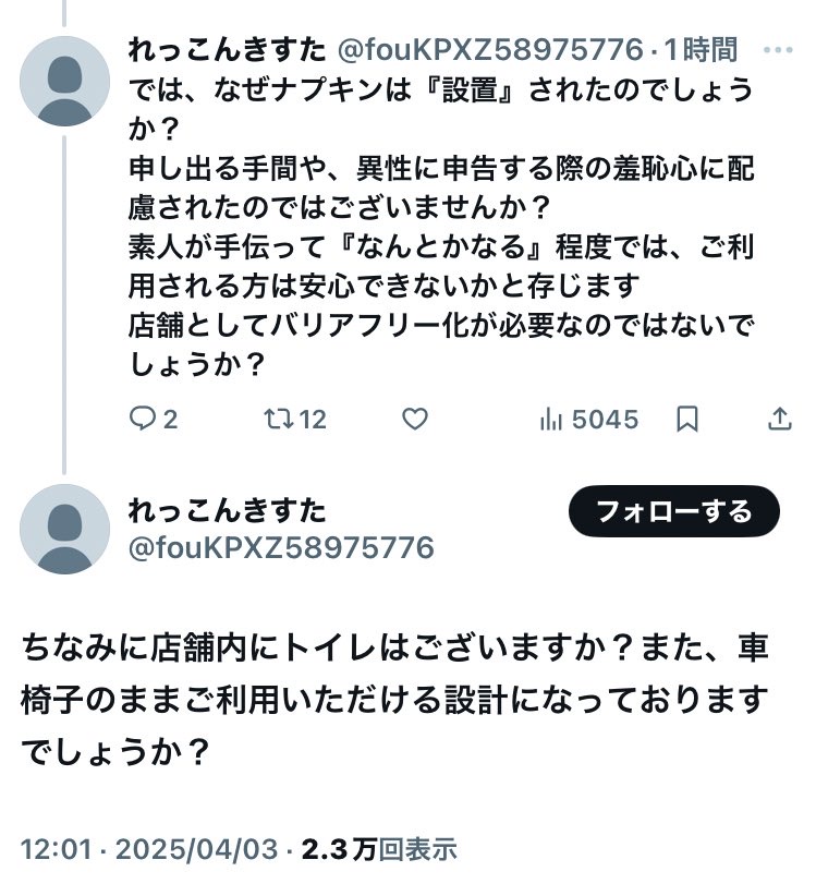 生理ナプキンを女子トイレに設置する店、弱者男性に激怒され炎上「差別はやめろ!!🧀🐮」