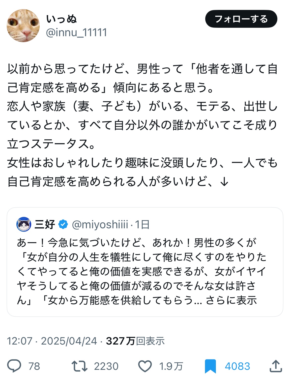 どう考えても他者からの承認欲求が高いのは女さんじゃん
