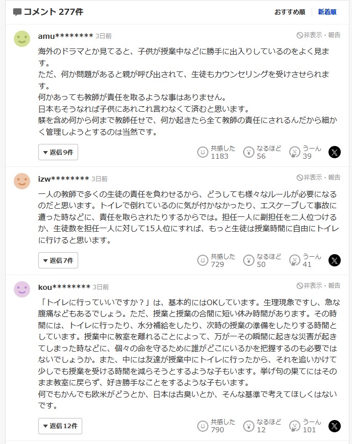 生徒「トイレに行っていいですか?」識者「日本の学校では生理現象を申告させられる。海外で名物になってる🤓」