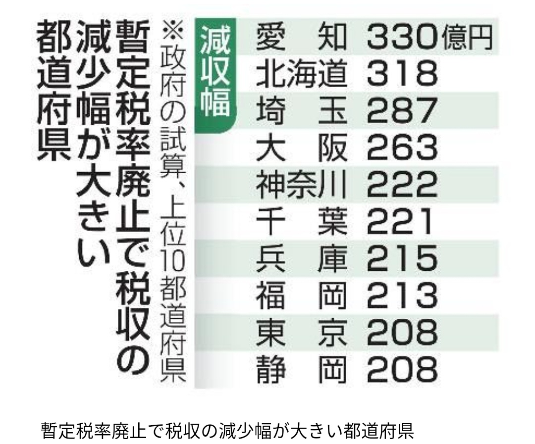 ガソリン税などに上乗せされる暫定税率が廃止された場合、地方自治体の税収の減少幅は最も多い愛知県で330億円となるなど、地方財政に広く影響が及ぶことが26日、政府の試算で分かった。