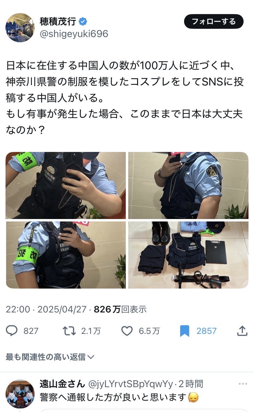 神奈川県警の制服を中国人が!?有事に備えろ!🤚彡 - 136 : 2025/04/28(月) 15:55:38.70 ID:T/yBVhmP0