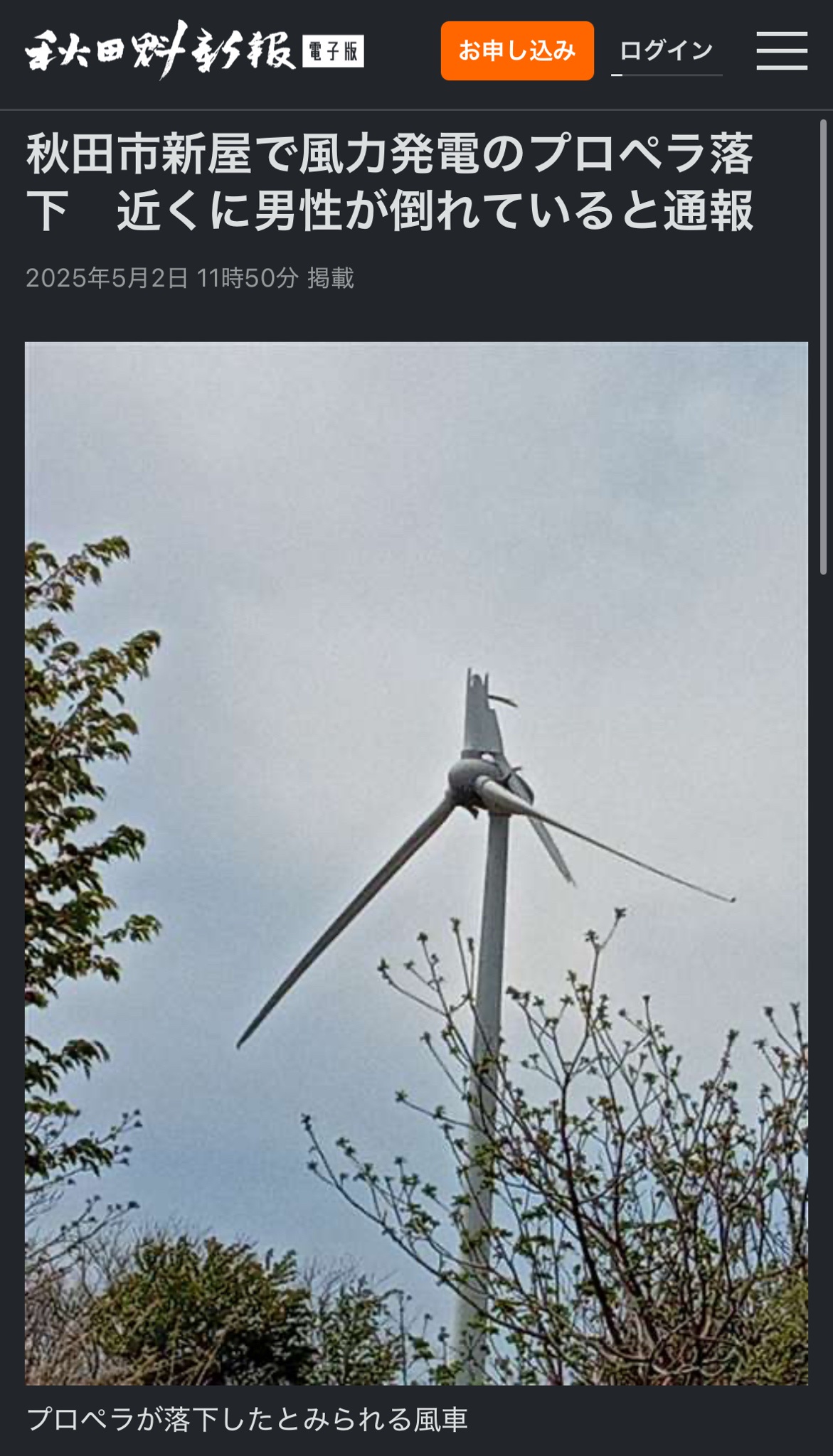 秋田市消防本部によりますと、2日午前10時すぎ秋田市新屋で風力発電のプロペラが落ちていると通りかかった人から通報がありました。消防が到着したところ近くで高齢の男性が倒れているのも見つかりました。