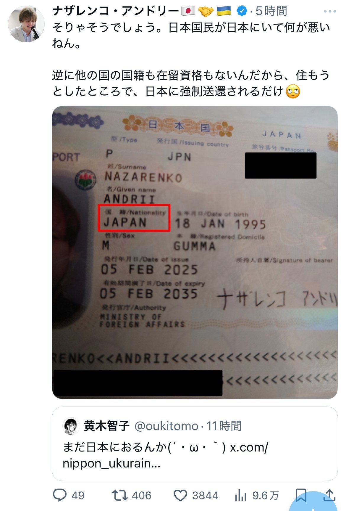 このツイートだと元から日本国民みたいだけどこいつウクライナ戦争始まってから帰化申請したんだっけ🙄