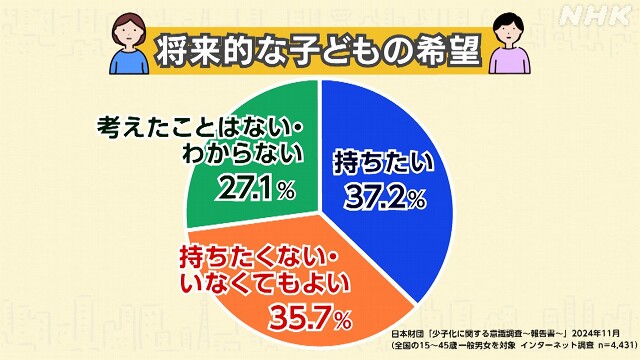 子どもを「持ちたくない・いなくてもよい」と答えた人は、2024年11月に公表された調査で、35.7%に上ります(日本財団「少子化に関する意識調査」)。