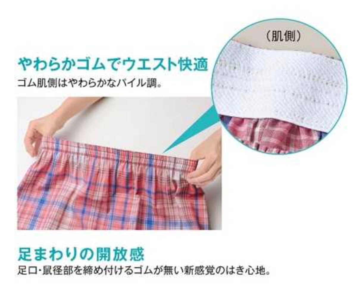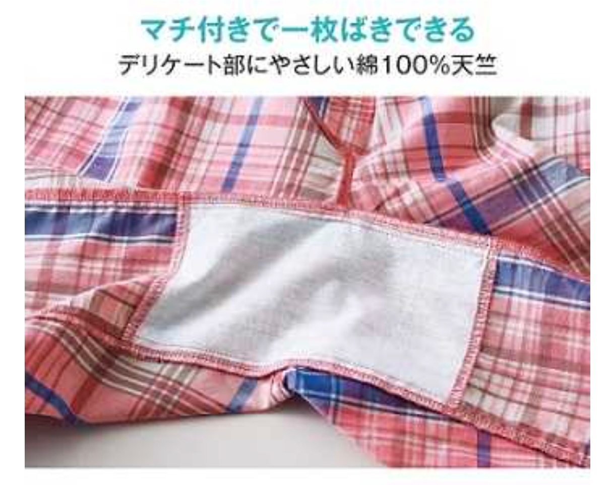 ウエストゴムの快適さや鼠径部の開放感など、爽やかな着心地はさらに追及し、デリケート部にやさしい綿100%のマチとかわいらしい色柄でそろえ、女性も抵抗感なく着用できます。