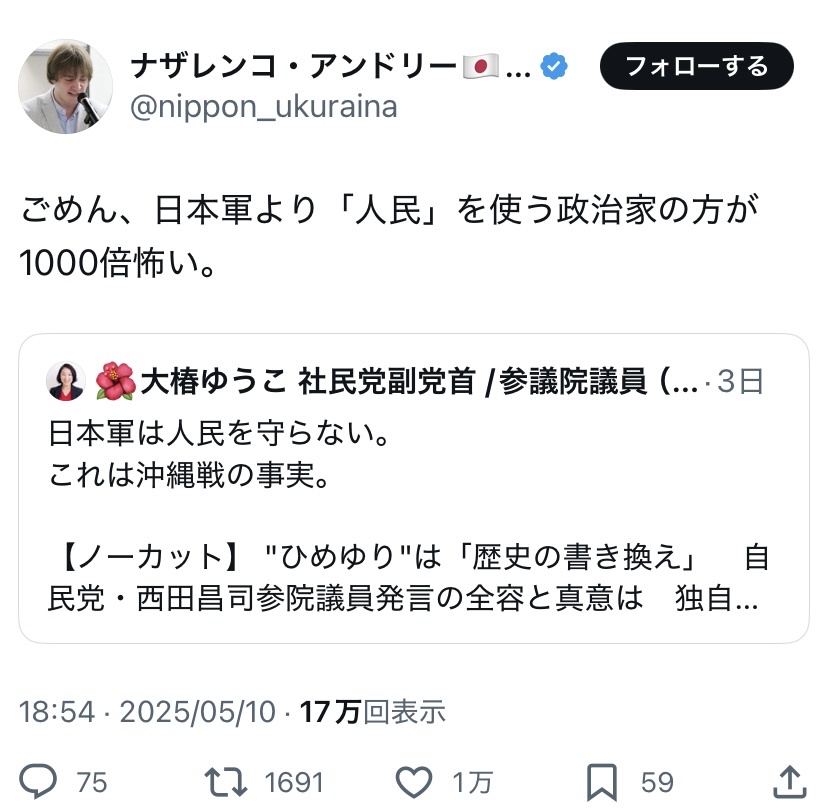 ナザレンコさん「ごめん、日本軍より「人民」を使う政治家の方が1000倍怖い。」→1万いーね