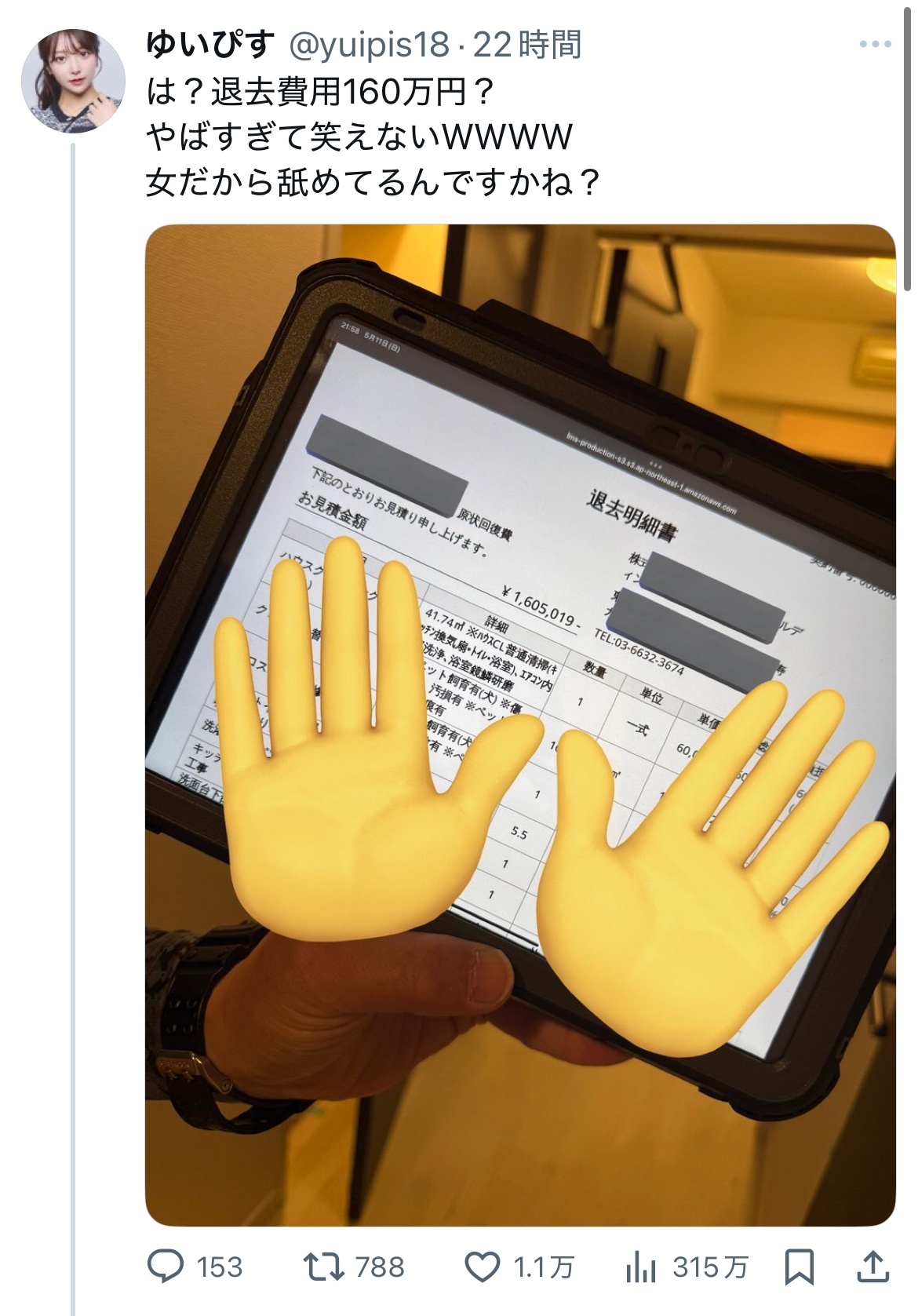 女の子「退去費用160万請求された!!!女だから舐めてるんですかね?」