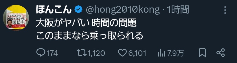 大阪が乗っ取られるーじゃないんだよお前らが不法在日入れた結果だろ。
