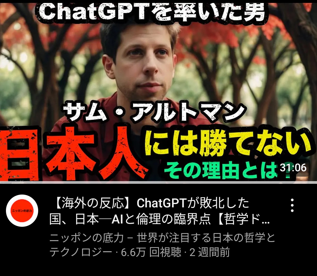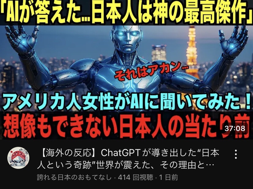 とか俺が今適当に考えた動画タイトルの内容をAIに動画作らせただけでも良い再生回数いきそう - 112 : 2025/05/15(木) 16:22:59.14 ID:SdjQmZl80