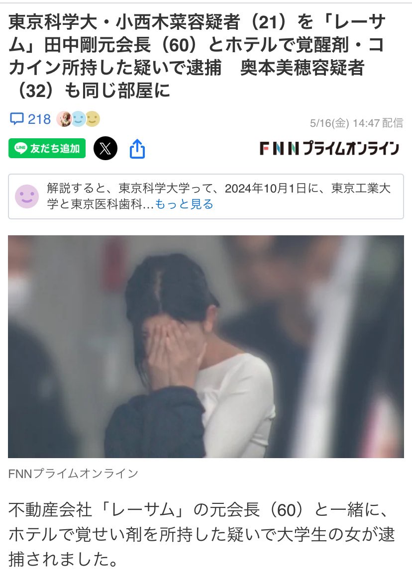 東京科学大・小西木菜容疑者(21)を「レーサム」田中剛元会長(60)とホテルで覚醒剤・コカイン所持した疑いで逮捕 奥本美穂容疑者(32)も同じ部屋に