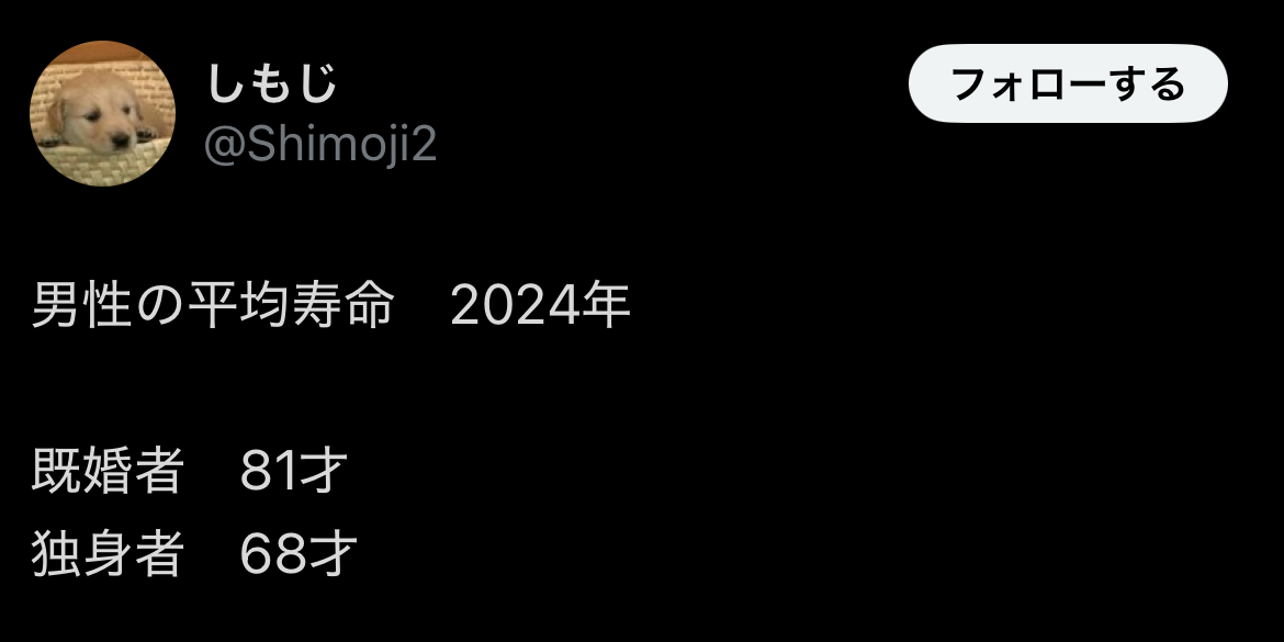 まぁ若くして亡くなるのが男の方が多いのはありそうだけど - 52 : 2025/05/18(日) 00:03:27.68 ID:qssQqZ5Q0