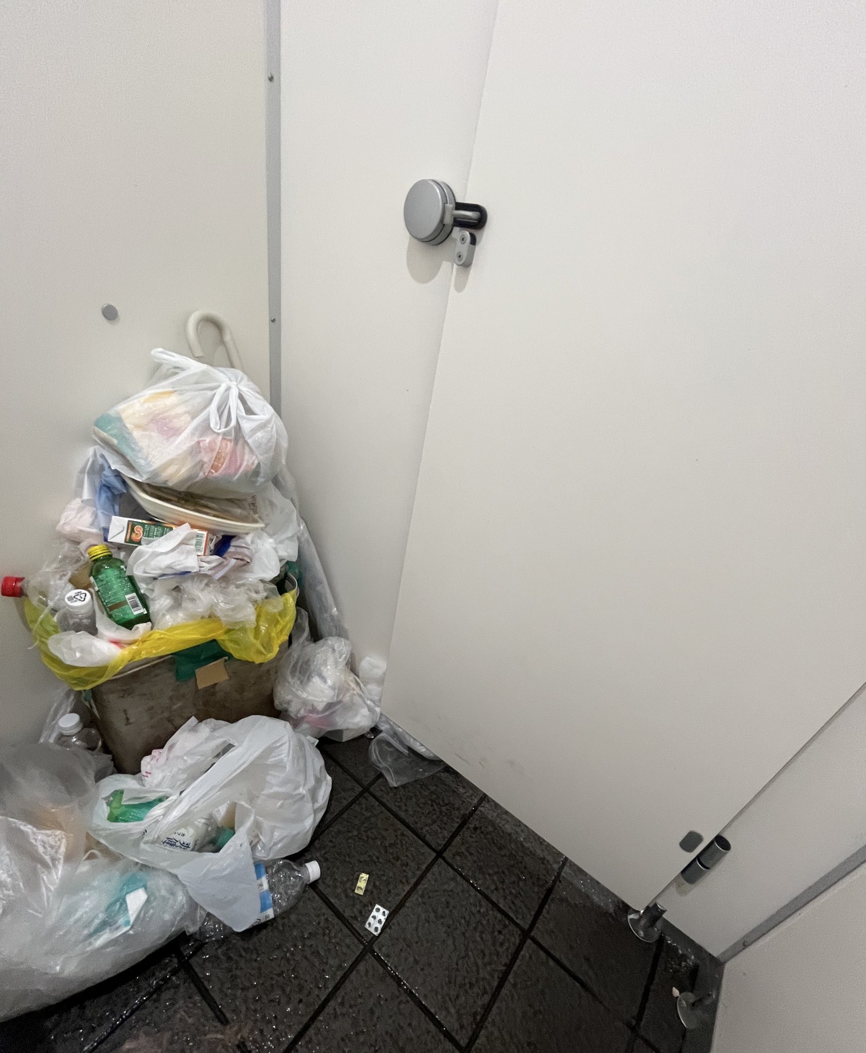朝の7時半で弁当のゴミがそのまま置いてあったりゴミだらけ(個室の中)