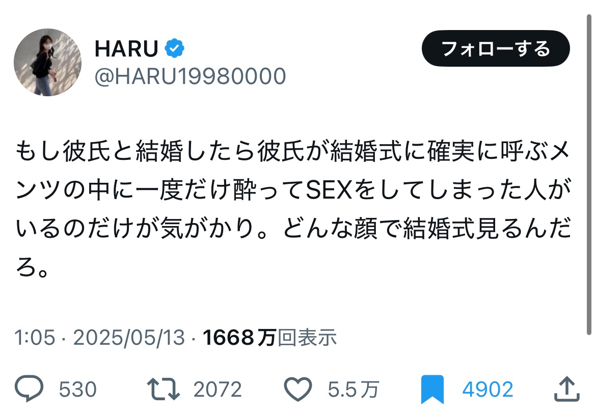 女さん「彼氏と結婚したら確実に結婚式に来るメンツに酔ってセクロスしちゃった人がいる」5.5万いいね