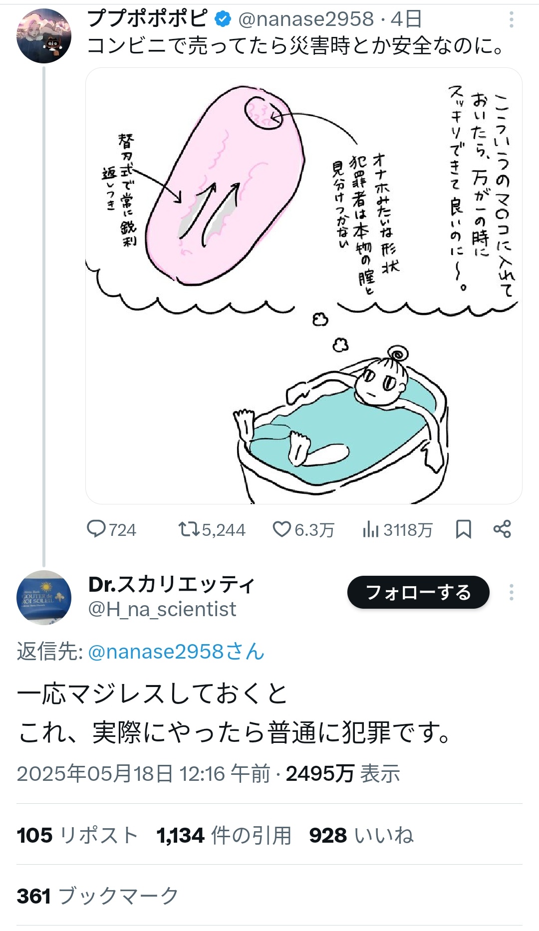 それが壊れて自分のま●こがズタズタになったらって思ってしまうわ - 16 : 2025/05/20(火) 23:19:18.25 ID:HUqxn3LMd