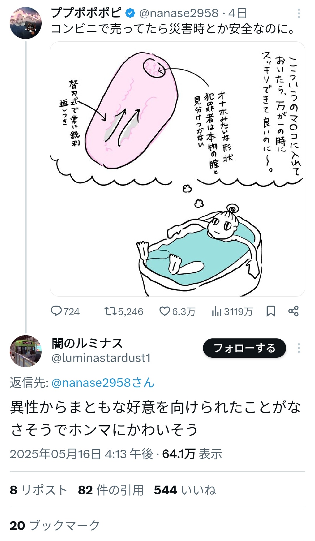 女性「ま●こに刃物入れてレイプ犯のチ●コズタズタにしたい」弱男「犯罪!」「モテないだろ」