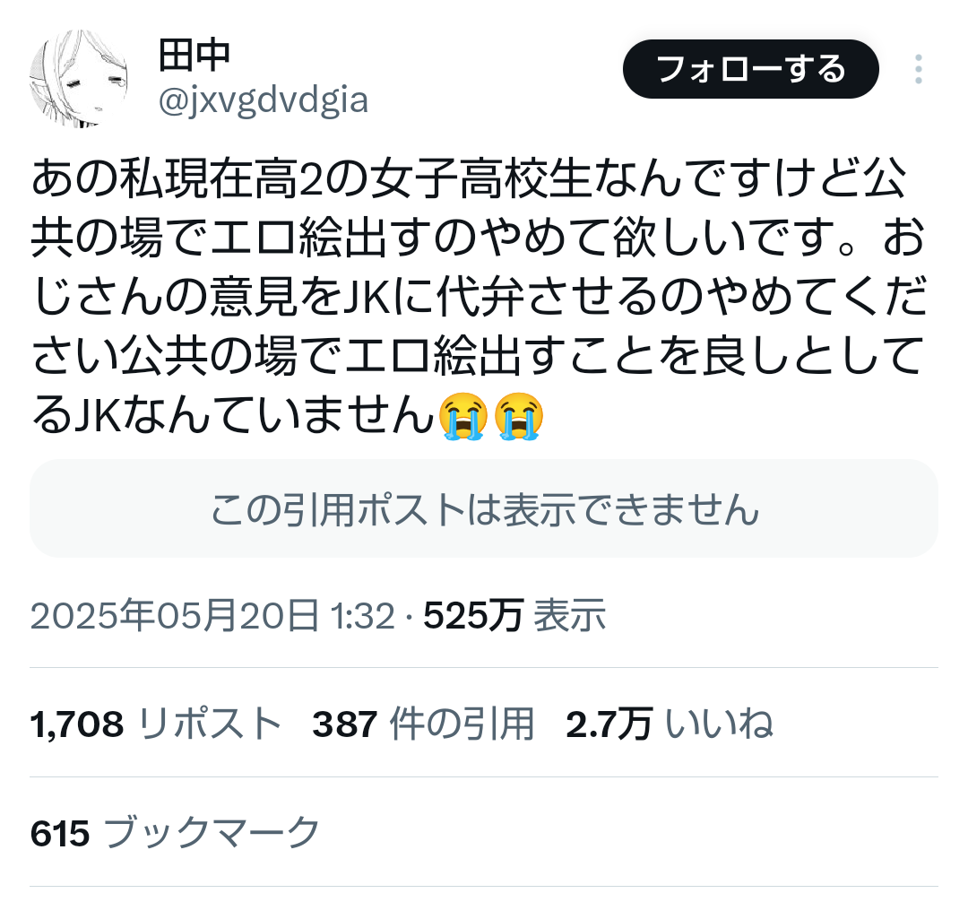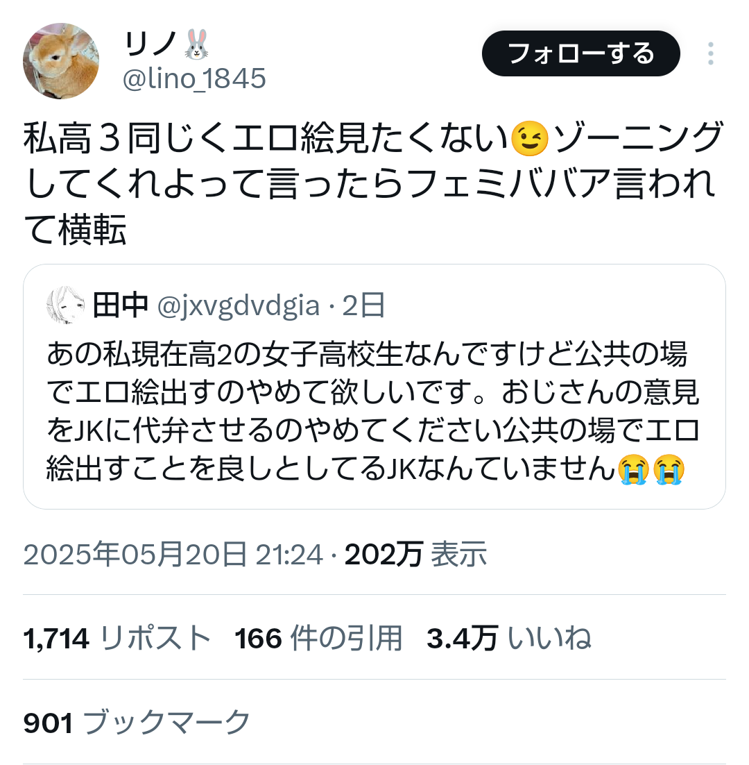 (ヽ´ん`)「街中に二次ロリ絵があっても怒るのはフェミババァだけ。JKは気にしない」JK「二次ロリ見たくない」