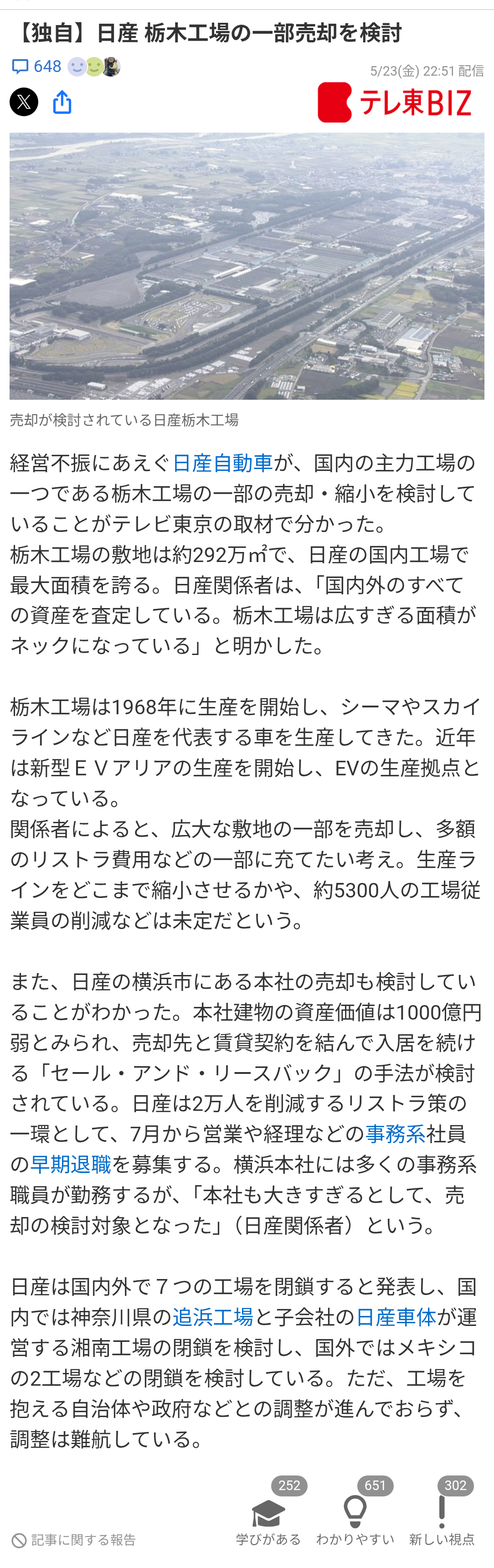 日産逝く、栃木工場も売却か……マジでジャップの終わりの始まり…日本が落ちぶれていくの見るのがつれぇわw
