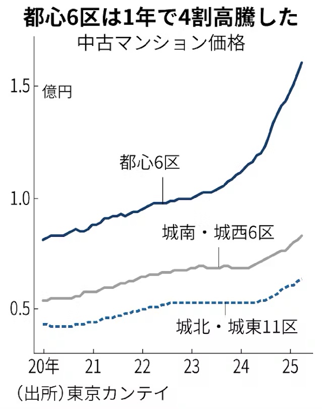 都心6区(千代田・中央・港・新宿・文京・渋谷)は前年同月比で38.6%高くなった。国内外の富裕層などからの投資が続いており、価格高騰が続いている。
