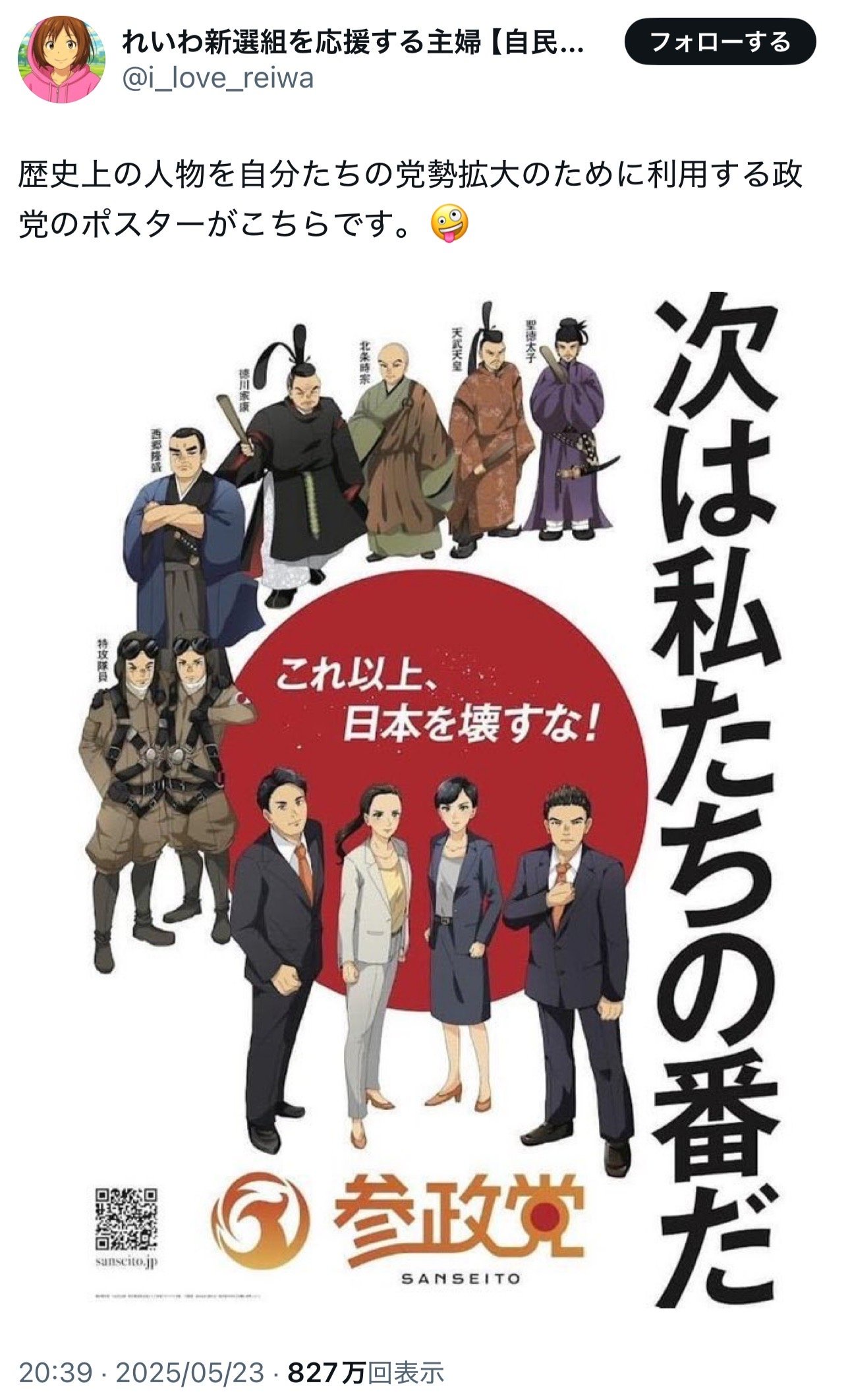 【画像】れいわ新選組の信徒「歴史上の人物を政党拡大のために使う参政党w」お前が言うなと大炎上www
