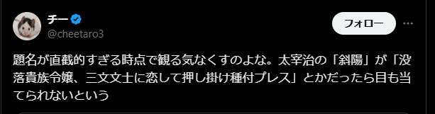 X識者「太宰治の『斜陽』のタイトルが『没落貴族令嬢、三文文士に恋して押し掛け種付プレス』だったら読む気が失せるでしょ?」