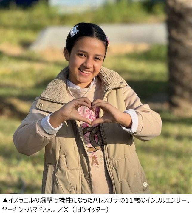 英紙ガーディアンは、ガザ地区の最年少インフルエンサー、ヤーキン・ハマドさん(11)が24日夜(現地時間、以下同じ)、ガザ地区北部デイル・アル=バラフ地域でイスラエルの空爆によって死亡したと26日報じた。ヤーキン・ハマドさんは砲声が響く中でも明るい笑顔を忘れず、避難民に救護用品を配る奉仕活動などに当たってきた。