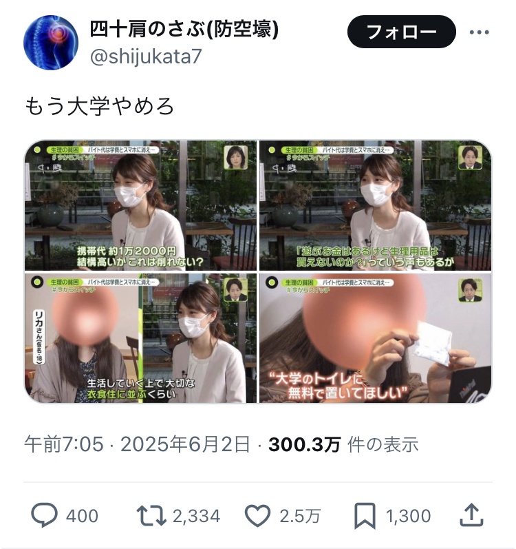 女性さん「生理用品を無料にして!!!携帯代(月12000円)も遊ぶお金も削りたくないの😭」 2.5万いいね