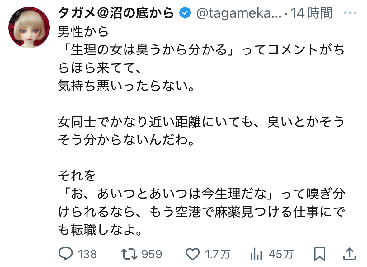 それが生理の匂いだと答え合わせできる男は一部だけだろ