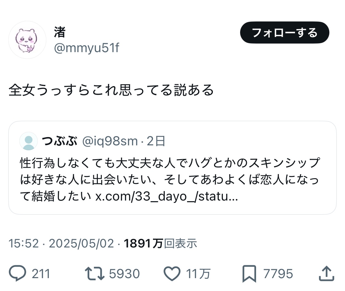 女さん👧「全女、性欲なくてハグだけしてくれる男と結婚したい」