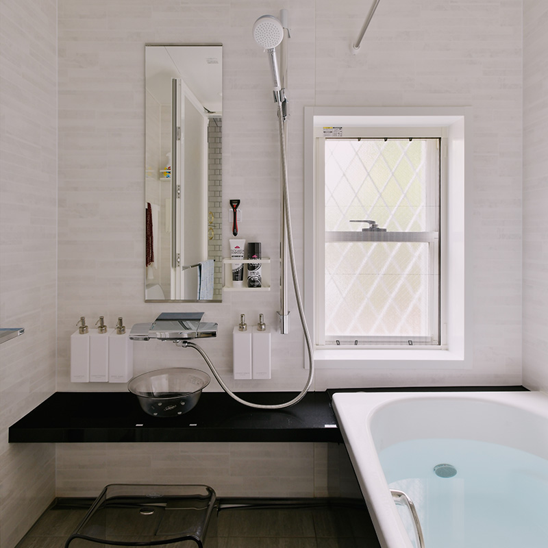 > 浴場に備え付けの棚にスマートフォンを隠して