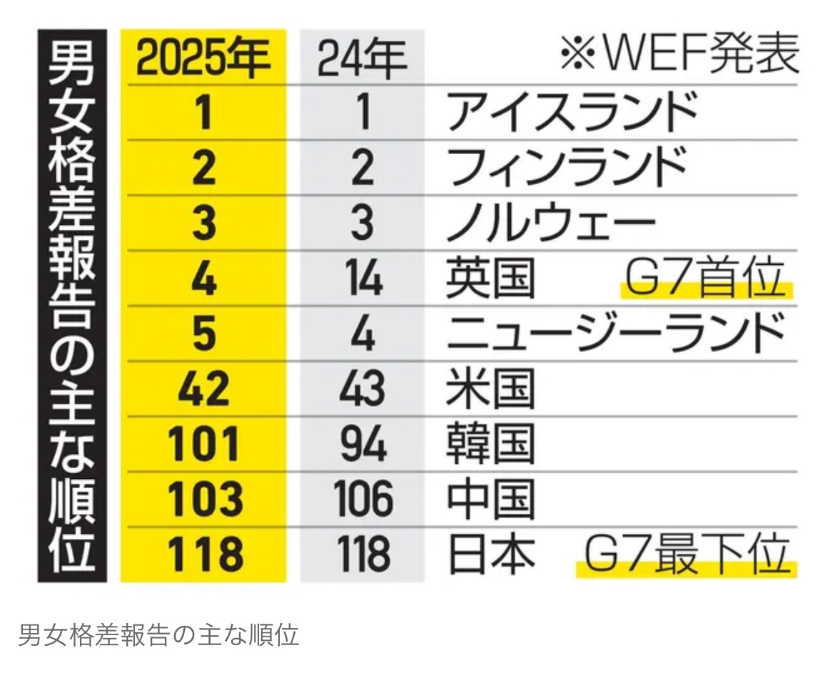 【ジュネーブ共同】スイスのシンクタンク、世界経済フォーラム(WEF)は12日、148カ国の男女平等度を順位付けした2025年版「男女格差(ジェンダー・ギャップ)報告」を発表し、日本は118位だった。24年版と同順位で、女性閣僚の減少や女性管理職の少なさなどが低迷の要因となった。先進7カ国(G7)では引き続き最下位。下から2番目で、85位だったイタリアに大きく引き離されており、格差解消のペースも遅れている。報告は政治、経済、教育、健康の4分野で男女間の格差を分析して数値化した。世界全体では今回、経済と政治で大きな改善が見られたが、「完全な男女平等を実現するにはまだ123年かかる」と試算。格差を埋める努力を強化するよう各国に促した。