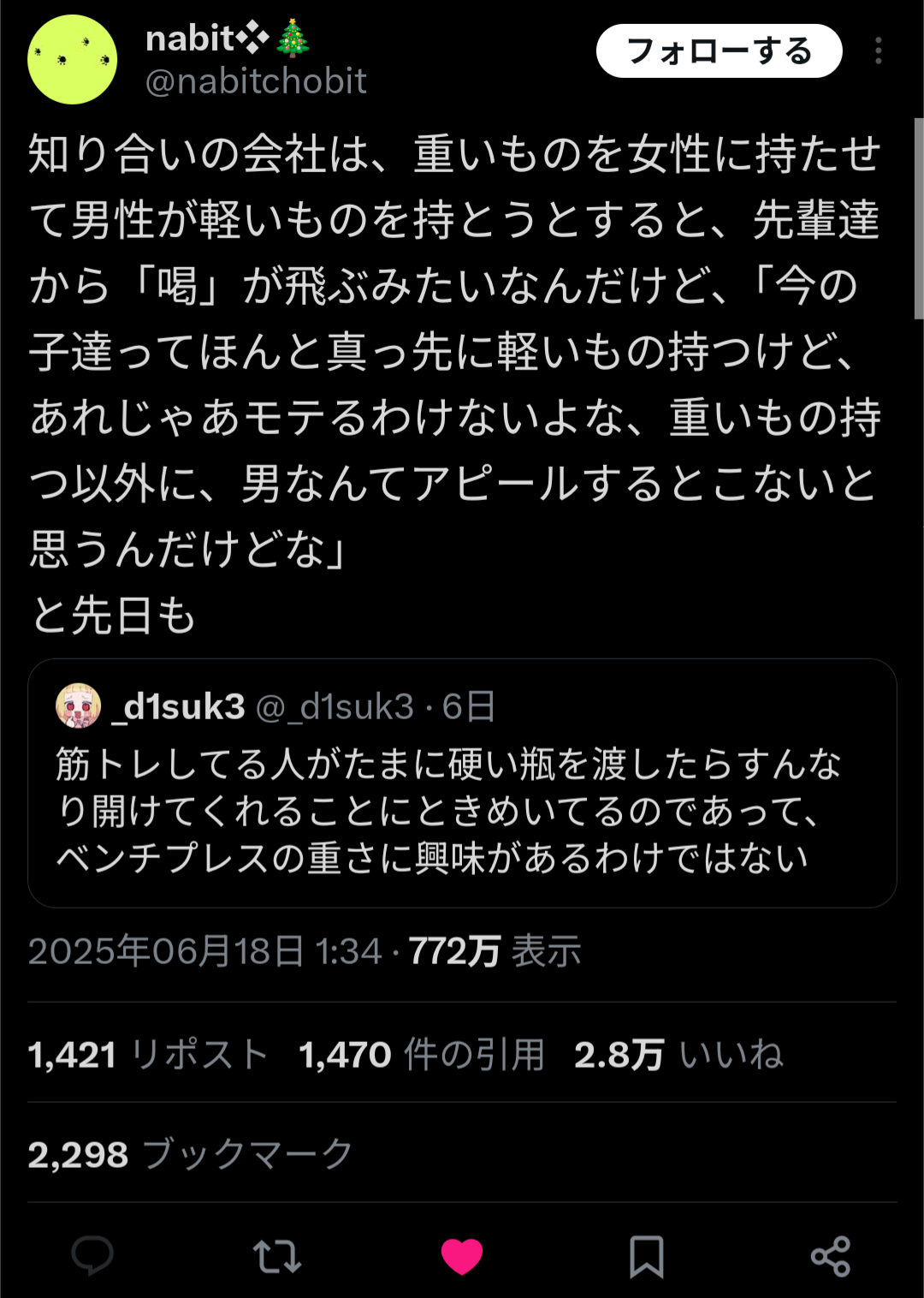 まんさん「知り合いの会社には女性に重い物を持たせようとする男社員がいたら即座に激怒してくれる、頼れる上司がいます🙆」