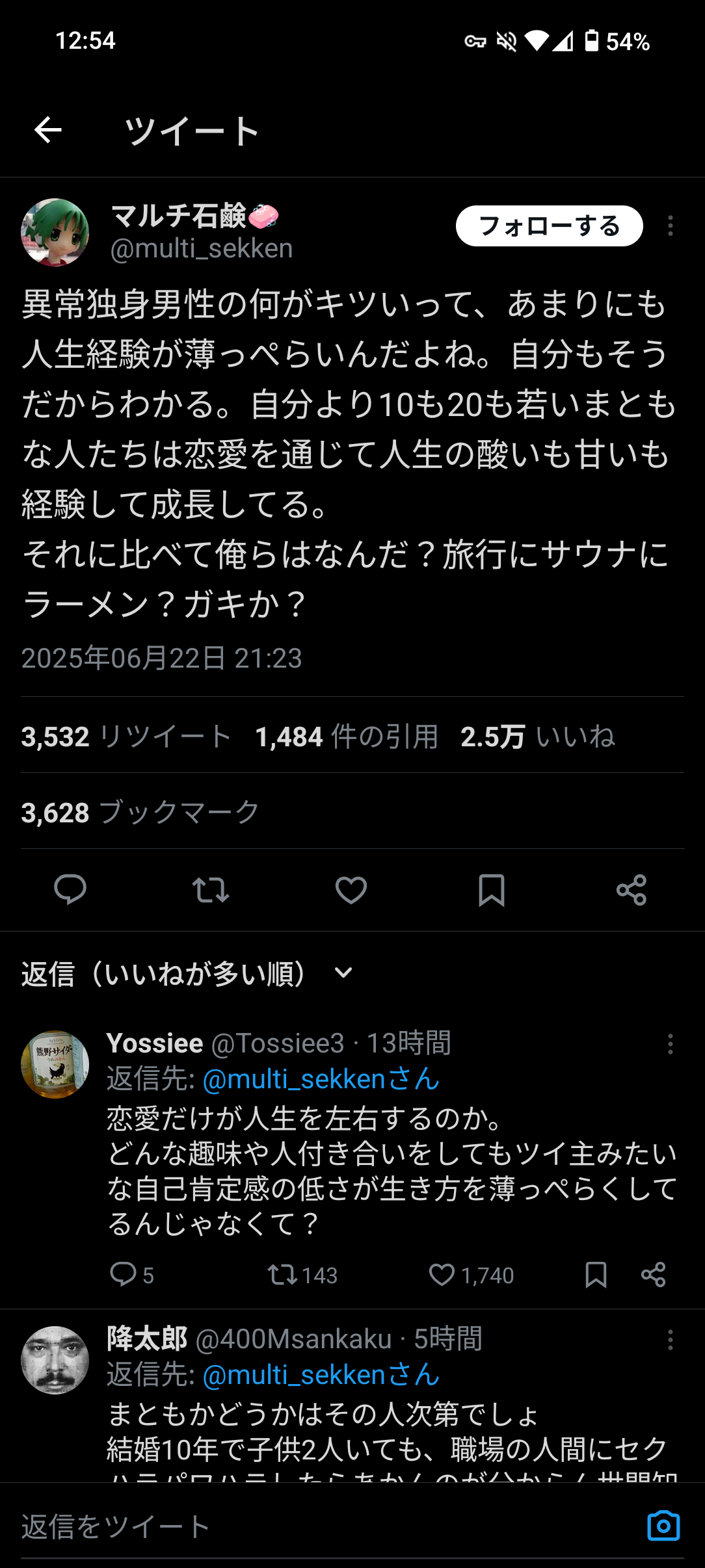 X民「独身男性の何がキツいって人生経験が薄っぺらいんだよね、まともな人は恋愛を通じて酸いも甘いも経験してる」